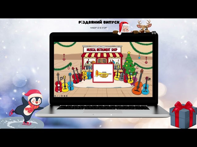 ✨ Санта та ельфи – набір із 4 ігор для вивчення нот на додаткових лінійках у скрипковому та басовому ключах ( Також є слайди з буквеними позначенням нот ).✨ Пряничний будинок – весела гра для пошуку тону або півтону на клавіатурі.✨ Прикрашай ялинку – допомагає запам’ятати ноти, які пишуться на лінійках та між ними в скрипковому ключі.✨ Різдвяна крамниця – обирайте іграшки та вирішуйте музичні приклади.✨ Білочка та подарунки – допоможіть білочці роздати подарунки друзям, знаходячи ноти з дієзами та бемолями на клавіатурі.✨ Різдвяні пригоди оленятка Руді – віртуальна настільна гра, яка закріплює знання таких тем:• розташування нот на клавіатурі,• ноти першої октави,• знаки альтерації,• тривалості нот і пауз,• динамічні відтінки,• порядок написання дієзів біля ключа,• музичні розміри;•музичні інструменти.