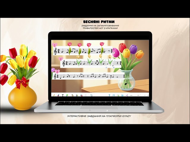 Весняне інтерактивне завдання на Gynzy для запам’ятовування нот із крапкою — четвертної, половинної та восьмої. Потрібно правильно розставити тактові рисочки-квіти